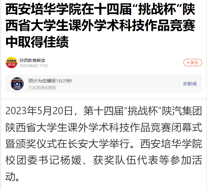 搜狐新闻:西安培华学院在十四届“挑战杯”陕西省大学生课外学术科技作品竞赛中取得佳绩