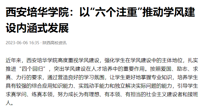 近年来,西安培华学院高度重视学风建设,强化学生在学风建设中的主体地位,扎实推进“四个回归”,突出学风建设在人才培养中的重要作用。按照爱国、励志、求真、力行的要求,通过营造良好的学习氛围,让学生更好地掌握专业知识,培养学生具有较强的综合应用知识能力、实践动手能力和独立解决实际问题的能力,引导学生求真学问、练真本领,努力成长为有理想、有本领、有担当的社会主义建设者和接班人。