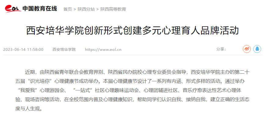 该校学生潜能发展中心主任韩赟表示,心理健康教育作为落实立德树人根本任务的重要抓手,西安培华学院坚持将育心和育人相结合,以生涯规划为引领,促进学生心理健康,助力大学生身心健康发展为目标,进一步提升大学生心理健康工作的针对性和有效性,持续多样化、立体化、个性化探索心理育人新模式和新方法。
