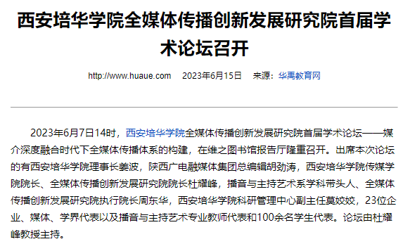 2023年6月7日14时,西安培华学院全媒体传播创新发展研究院首届学术论坛——媒介深度融合时代下全媒体传播体系的构建,在维之图书馆报告厅隆重召开。出席本次论坛的有西安培华学院理事长姜波,陕西广电融媒体集团总编辑胡劲涛,西安培华学院传媒学院院长、全媒体传播创新发展研究院院长杜耀峰,播音与主持艺术系学科带头人、全媒体传播创新发展研究院执行院长周东华,西安培华学院科研管理中心副主任莫姣姣,23位企业、媒体、学界代表以及播音与主持艺术专业教师代表和100余名学生代表。论坛由杜耀峰教授主持。