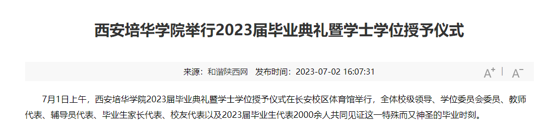 7月1日上午,西安培华学院2023届毕业典礼暨学士学位授予仪式在长安校区体育馆举行,全体校级领导、学位委员会委员、教师代表、辅导员代表、毕业生家长代表、校友代表以及2023届毕业生代表2000余人共同见证这一特殊而又神圣的毕业时刻。