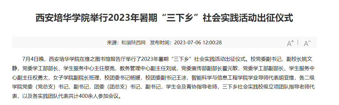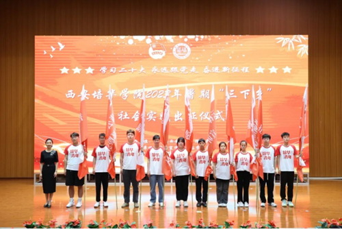 7月4日晚,西安培华学院在维之图书馆报告厅举行了2023年暑期“三下乡”社会实践活动出征仪式。校党委副书记、副校长姚文静,党委学工部部长、学生服务中心主任蔡亮,教务管理中心副主任刘斌,党委宣传部副部长霍元敏,党委学工部副部长、学生服务中心副主任权勇太,女子学院副院长班理,校团委书记杨媛,校团委副书记王冰,智能科学与信息工程学院学业导师代表胡亚维,各二级学院党委(党总支)书记、副书记,团委(团总支)书记、副书记,学生会及青协指导老师,三下乡社会实践校级立项团队指导老师代表,以及各实践团队代表共计400余人参加会议。