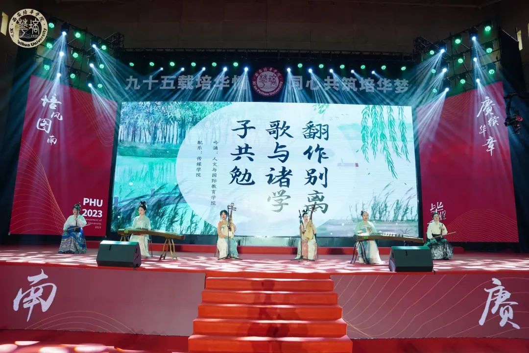 毕业典礼最后,由人文与国际教育学院和传媒学院教师带来的古乐吟诵节目《翻作别离歌与诸学子共勉》,在时空穿越中,用音乐彰显培华女性教育的魅力,感受中华传统文化的韵律,传递培风图南的祝福。