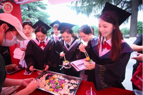 2023年,正值学校建校95周年,场馆外,学校特别搭建了意义深远的“95周年历史长河”景观墙,设置了励志古诗词的道旗与路标,与“平步青云”“掷地有声”“功不‘糖’捐”“事事如意”的毕业游戏互动区遥相呼应,毕业生们手持“致青春”“前程似锦”“乘风破浪”“未来可期”等主题元素的手牌纷纷合影留念。