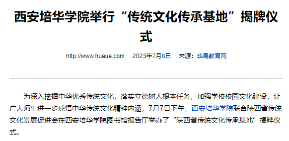 此次活动旨在进一步弘扬中华优秀传统文化,构建和谐校园,切实提高学校德育教育的针对性和实效性。“传统文化传承基地”的搭建,也将为西安培华学院致力传承优秀传统文化的教育插上梦想的翅膀。