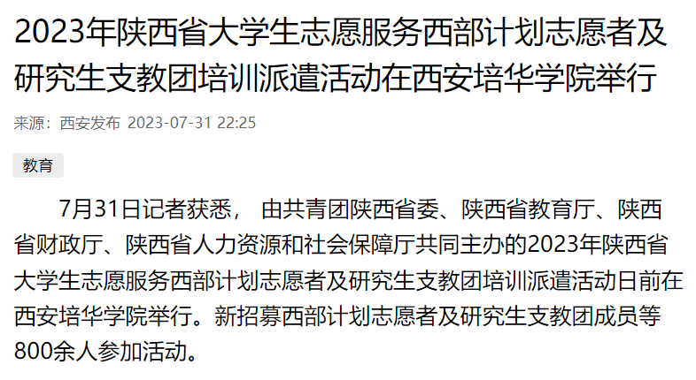 7月31日记者获悉, 由共青团陕西省委、陕西省教育厅、陕西省财政厅、陕西省人力资源和社会保障厅共同主办的2023年陕西省大学生志愿服务西部计划志愿者及研究生支教团培训派遣活动日前在西安培华学院举行。新招募西部计划志愿者及研究生支教团成员等800余人参加活动。
