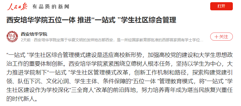 “一站式 ”学生社区综合管理模式建设是适应高校新形势,加强高校党的建设和大学生思想政治工作的重要体制创新。西安培华学院紧紧围绕立德树人根本任务,坚持以学生为中心,大力推进学院制下“一站式 ”学生社区管理模式改革,创新工作机制和路径,探索构建党建引领、队伍下沉、文化沁润、学生主体、条件保障的“五位一体 ”管理教育模式,将“一站式 ”学生社区建设作为学校深化“三全育人”改革的前沿阵地,努力培养青年成为堪当民族复兴重任的时代新人。
