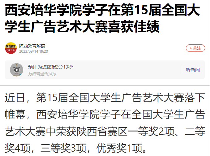 搜狐新闻:西安培华学院学子在第15届全国大学生广告艺术大赛喜获佳绩