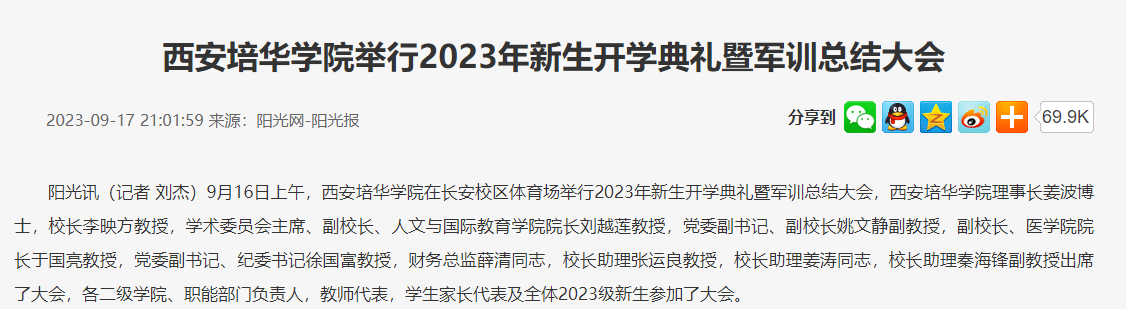 阳光讯(记者 刘杰)9月16日上午,西安培华学院在长安校区体育场举行2023年新生开学典礼暨军训总结大会,西安培华学院理事长姜波博士,校长李映方教授,学术委员会主席、副校长、人文与国际教育学院院长刘越莲教授,党委副书记、副校长姚文静副教授,副校长、医学院院长于国亮教授,党委副书记、纪委书记徐国富教授,财务总监薛清同志,校长助理张运良教授,校长助理姜涛同志,校长助理秦海锋副教授出席了大会,各二级学院、职能部门负责人,教师代表,学生家长代表及全体2023级新生参加了大会。