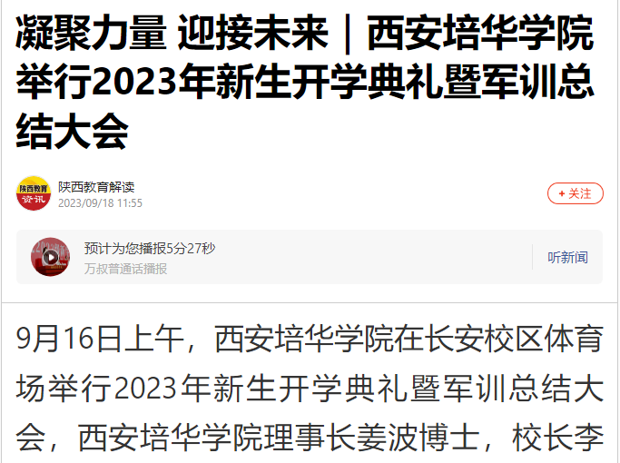 搜狐新闻:凝聚力量 迎接未来|西安培华学院举行2023年新生开学典礼暨军训总结大会