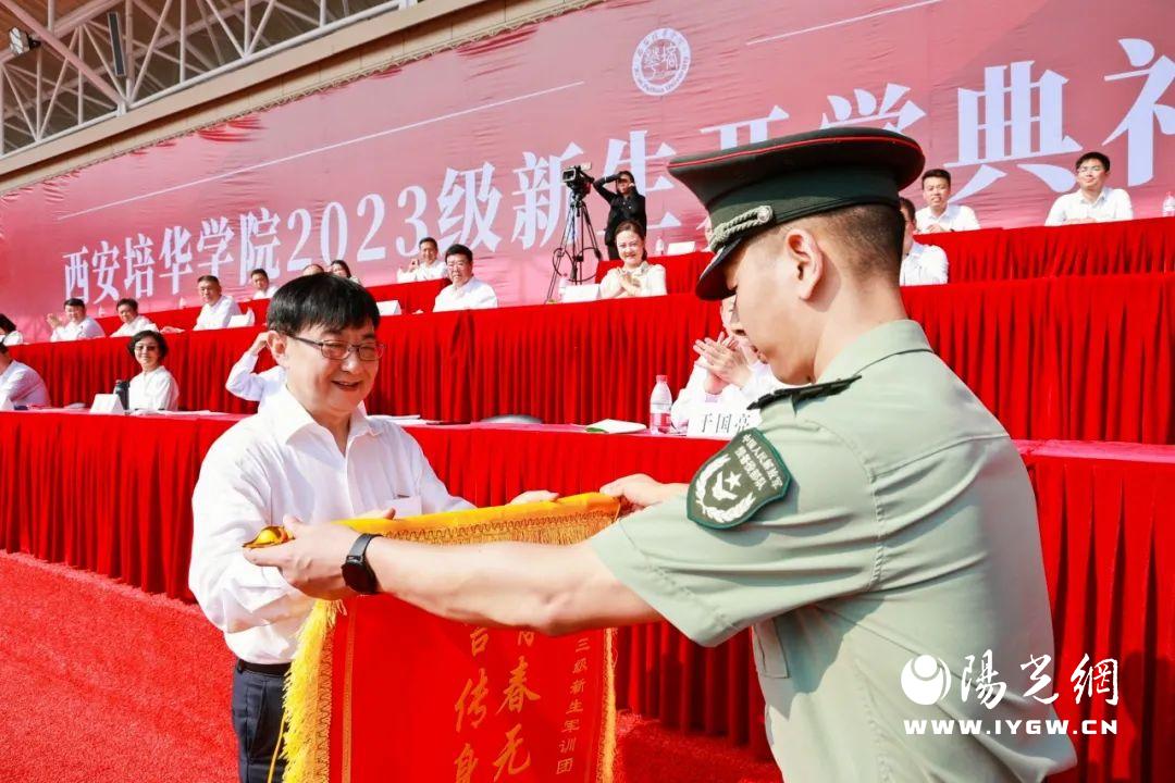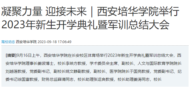 9月16日上午,西安培华学院在长安校区体育场举行2023年新生开学典礼暨军训总结大会,西安培华学院理事长姜波博士,校长李映方教授,学术委员会主席、副校长、人文与国际教育学院院长刘越莲教授,党委副书记、副校长姚文静副教授,副校长、医学院院长于国亮教授,党委副书记、纪委书记徐国富教授,财务总监薛清同志,校长助理张运良教授,校长助理姜涛同志,校长助理秦海锋副教授出席了大会,各二级学院、职能部门负责人,教师代表,学生家长代表及全体2023级新生参加了大会。