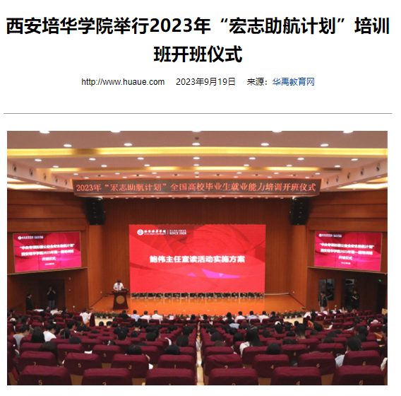9月13日,西安培华学院2023年“宏志助航计划”开班仪式在图书馆报告厅举行。西安文理学院招生与就业指导处处长、“宏志助航计划”全国高校毕业生就业指导咨询专家冯宁,学校党委副书记、副校长姚文静,招生与就业指导中心主任鲍伟、各二级学院领导、带班班主任及350名学员代表参加仪式。