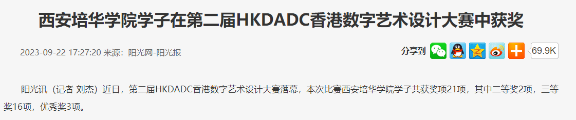 阳光讯(记者 刘杰)近日,第二届HKDADC香港数字艺术设计大赛落幕,本次比赛西安培华学院学子共获奖项21项,其中二等奖2项,三等奖16项,优秀奖3项。