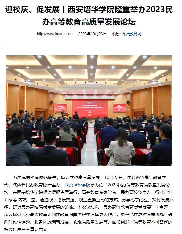 为庆祝培华建校95周年,助力学校高质量发展,10月22日,由陕西省高等教育学会、陕西省民办教育协会主办、西安培华学院承办的“2023民办高等教育高质量发展论坛”在西安培华学院明德楼报告厅举行。高等教育专家学者、民办高校负责人、行业企业专家等 齐聚一堂,通过线下论坛交流、线上直播互动的方式,分享办学经验、探讨发展路径,研讨民办高校高质量发展的策略。本次论坛以“民办高等教育高质量发展”为主题,深入探讨民办高等教育如何在教育强国进程中发挥更大作用,更好地在应对发展挑战、破解时代性课题、服务区域创新发展、实现高质量发展等方面如何发挥高等教育不可替代的积极作用具有重要意义。