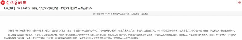 文化艺术网-文化艺术报讯(全媒体记者 杨红军 通讯员 文艺晨)近日,学校会计与金融学院举办了“九十五载薪火相传,非遗文化赓续文脉”非遗文化进校园活动。本次活动分为两个会场:在大学生活动中心进行室内演出,综合楼西广场进行室外展示。