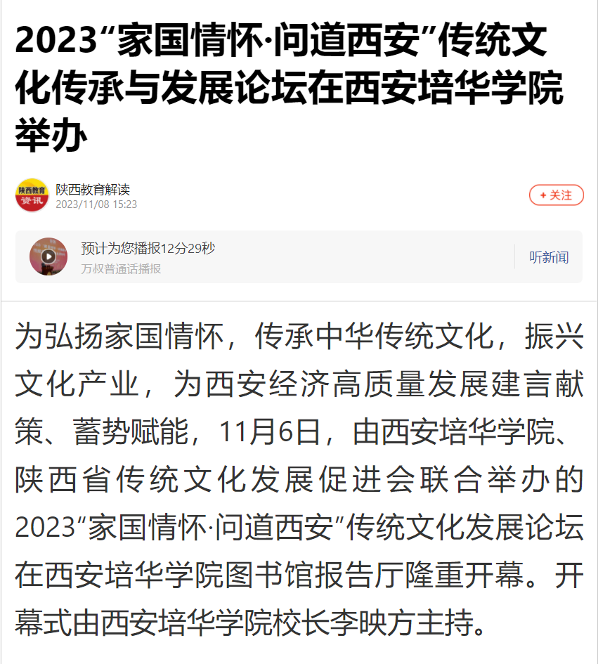 近年来,西安培华学院积极探索推进中华优秀传统文化进校园,不断增进师生对中华优秀传统文化的认知与认同,坚定文化自信,涵养家国情怀,深化爱国主义教育。此次活动的成功举办,是培华学院进一步弘扬和传承优秀发中华传统文化、培德育人的教学实践,也为拥有95年办学历史的培华学院再次腾飞插上文化的翅膀。