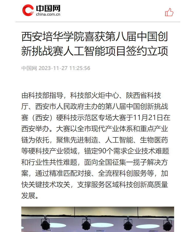 中国网:西安培华学院喜获第八届中国创新挑战赛人工智能项目签约立项