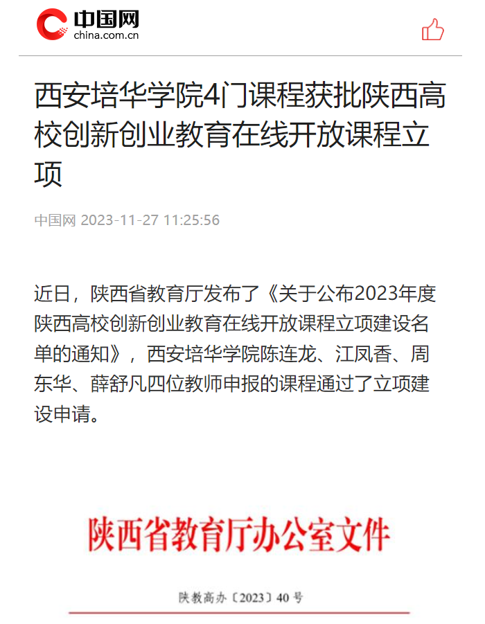 近日,陕西省教育厅发布了《关于公布2023年度陕西高校创新创业教育在线开放课程立项建设名单的通知》,西安培华学院陈连龙、江凤香、周东华、薛舒凡四位教师申报的课程通过了立项建设申请。