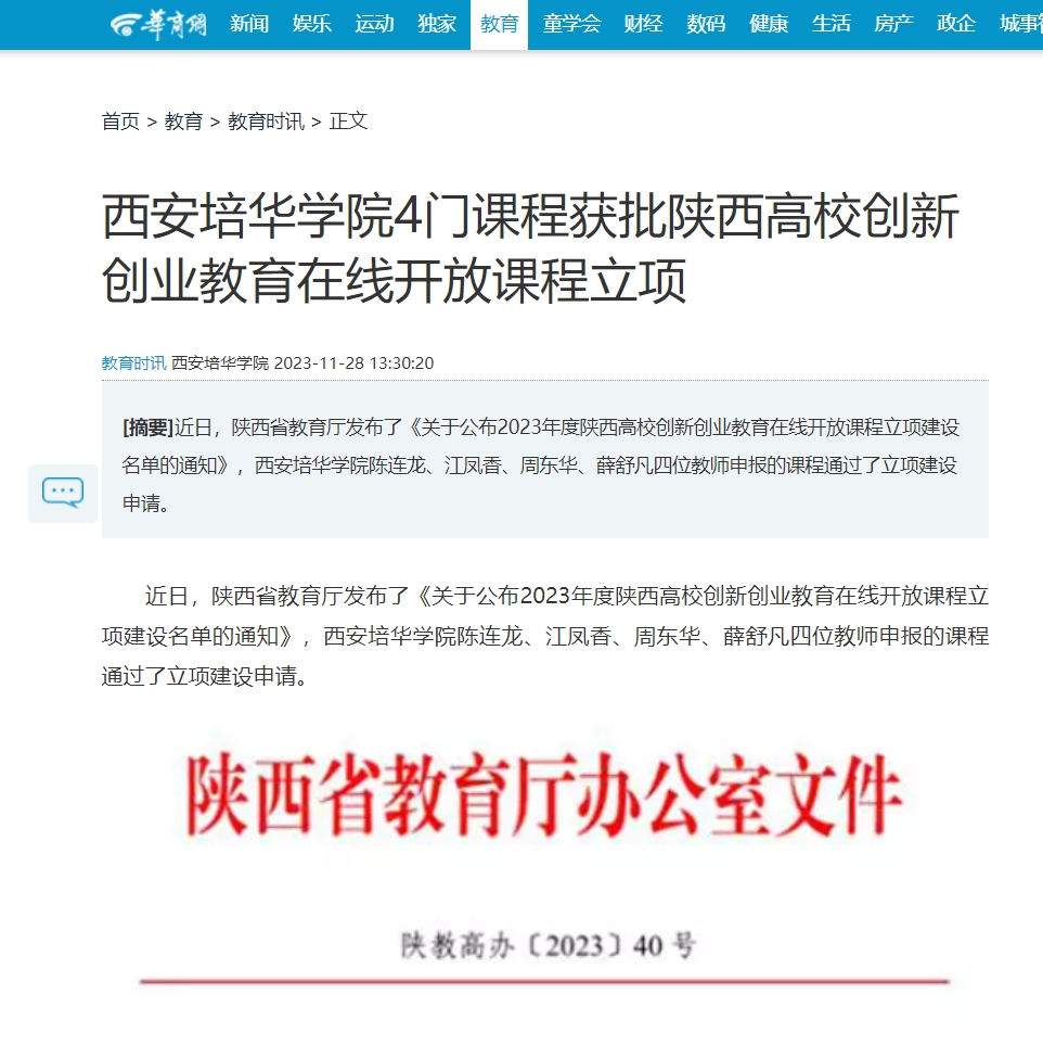 近日,陕西省教育厅发布了《关于公布2023年度陕西高校创新创业教育在线开放课程立项建设名单的通知》,西安培华学院陈连龙、江凤香、周东华、薛舒凡四位教师申报的课程通过了立项建设申请。