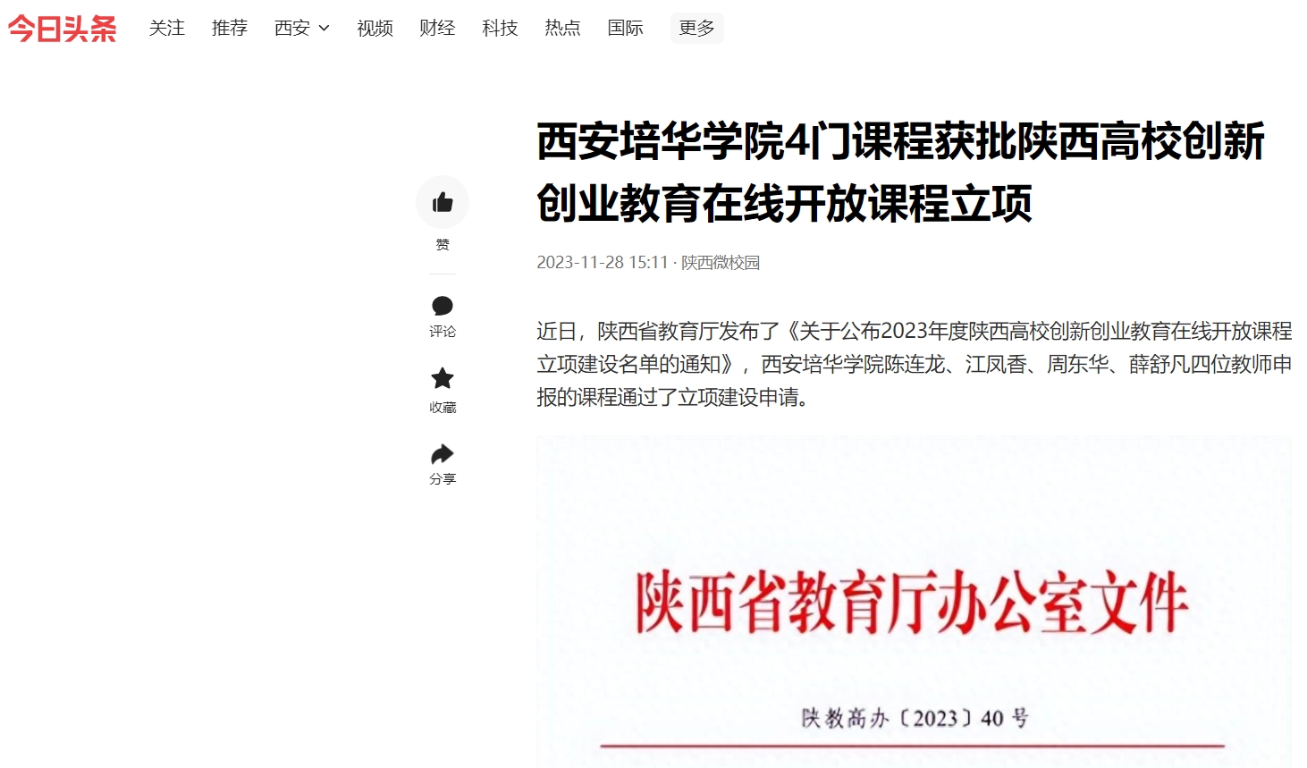 近日,陕西省教育厅发布了《关于公布2023年度陕西高校创新创业教育在线开放课程立项建设名单的通知》,西安培华学院陈连龙、江凤香、周东华、薛舒凡四位教师申报的课程通过了立项建设申请。