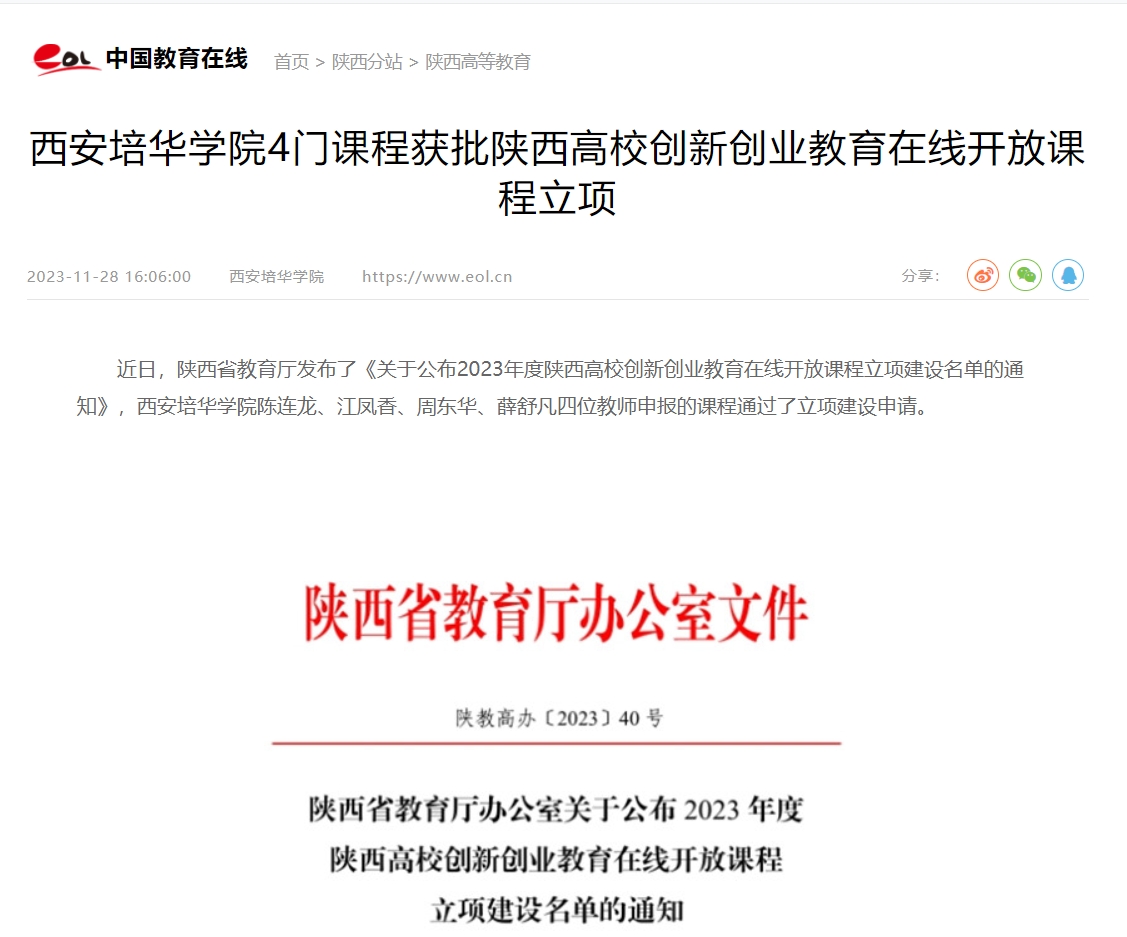近日,陕西省教育厅发布了《关于公布2023年度陕西高校创新创业教育在线开放课程立项建设名单的通知》,西安培华学院陈连龙、江凤香、周东华、薛舒凡四位教师申报的课程通过了立项建设申请。