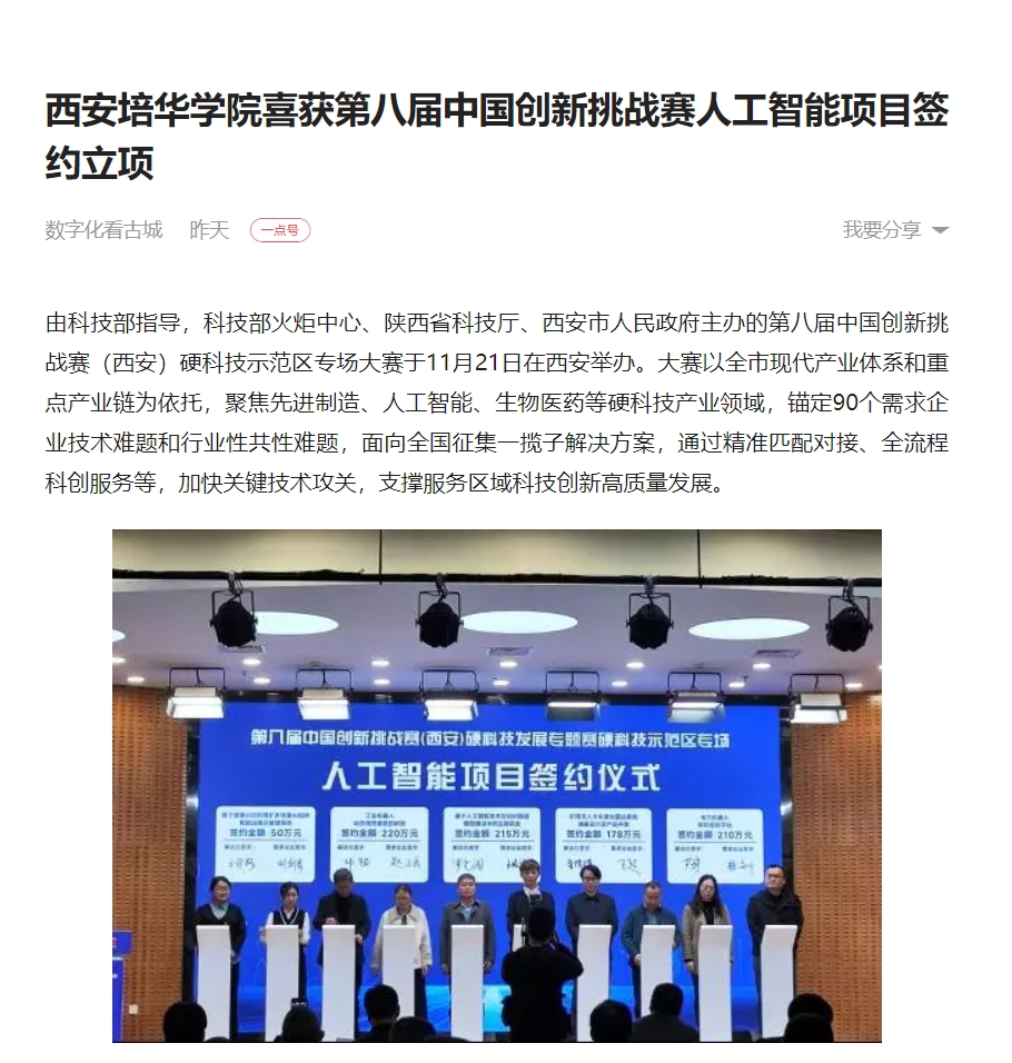 一点资讯:西安培华学院喜获第八届中国创新挑战赛人工智能项目签约立项