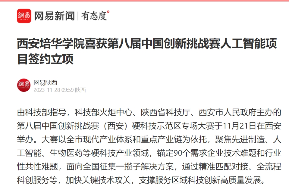 网易新闻:西安培华学院喜获第八届中国创新挑战赛人工智能项目签约立项