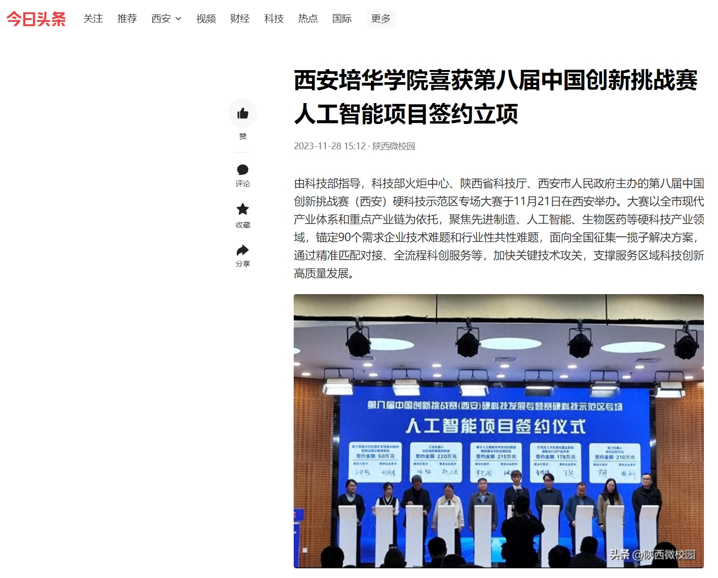 今日头条:西安培华学院喜获第八届中国创新挑战赛人工智能项目签约立项