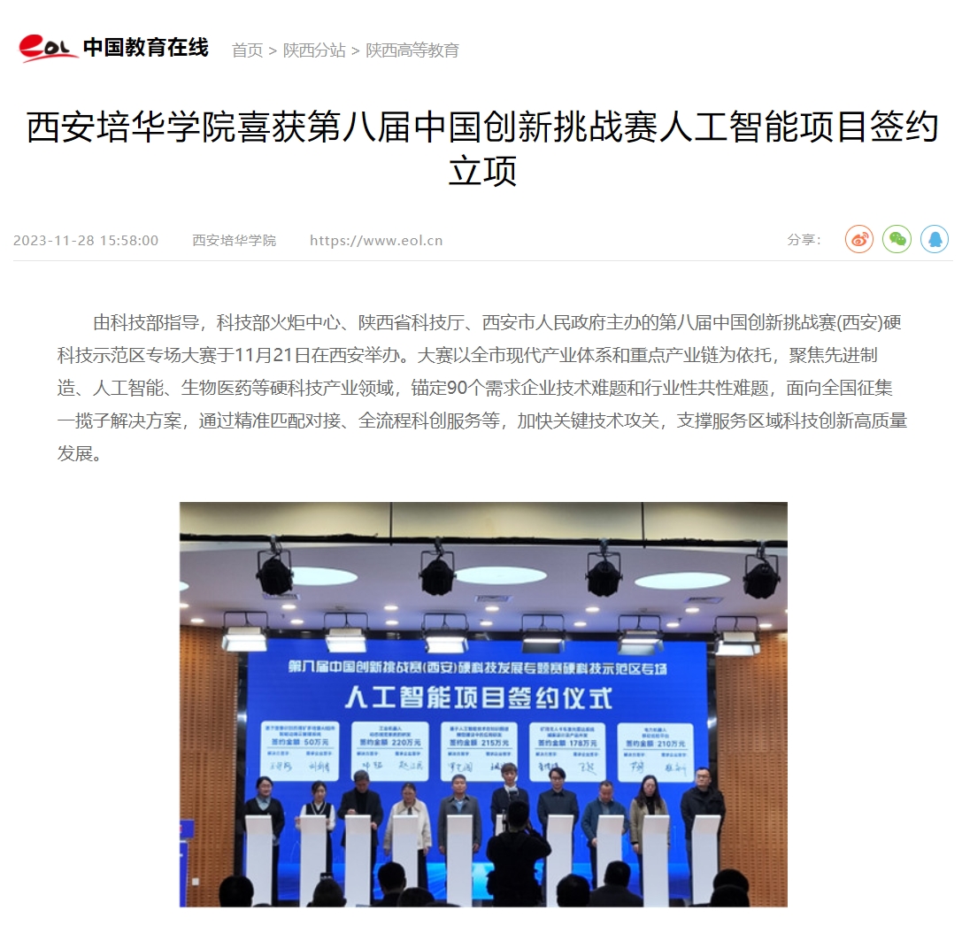 中国教育在线:西安培华学院喜获第八届中国创新挑战赛人工智能项目签约立项