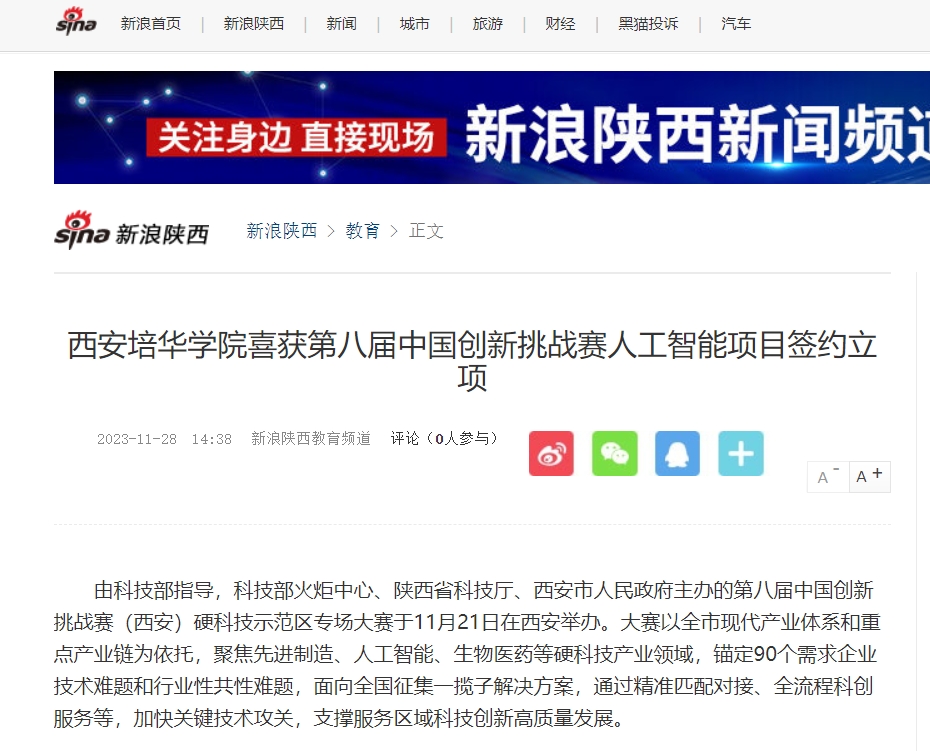 新浪:西安培华学院喜获第八届中国创新挑战赛人工智能项目签约立项