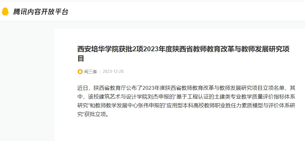 腾讯:西安培华学院获批2项2023年度陕西省教师教育改革与教师发展研究项目