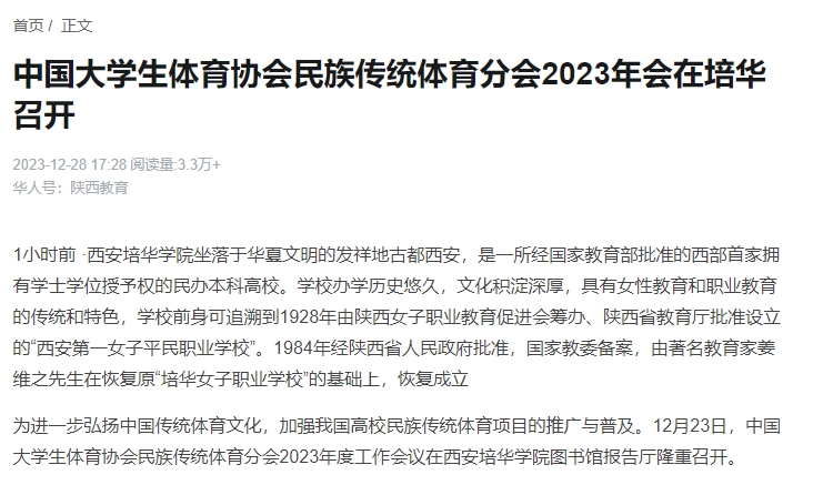 为进一步弘扬中国传统体育文化,加强我国高校民族传统体育项目的推广与普及。12月23日,中国大学生体育协会民族传统体育分会2023年度工作会议在西安培华学院图书馆报告厅隆重召开。