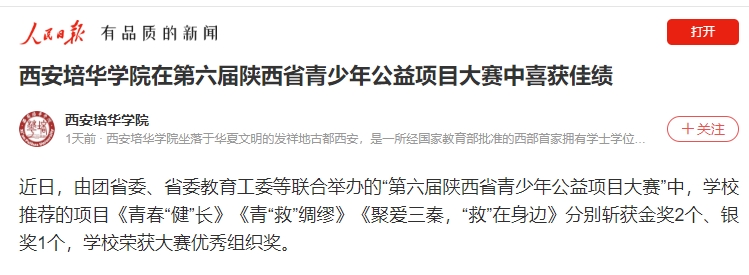 近日,由团省委、省委教育工委等联合举办的“第六届陕西省青少年公益项目大赛”中,西安培华学院推荐的项目《青春“健”长》《青“救”绸缪》《聚爱三秦,“救”在身边》分别斩获金奖2个、银奖1个,西安培华学院荣获大赛优秀组织奖。