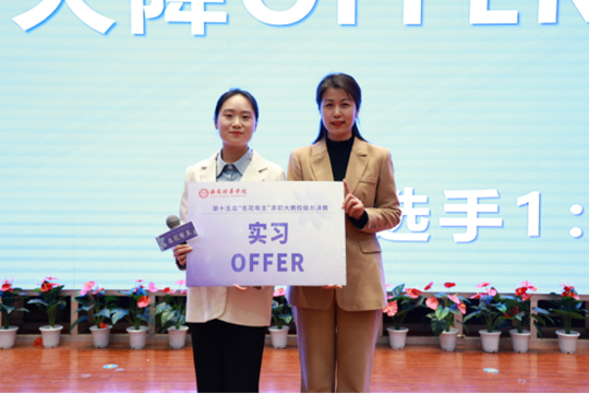 医学院护理学毕业生李巧曼,以其优异的表现、扎实的理论基础和丰富的实践经验获得了决赛现场所有评委的高度认可,成功拿到了心仪企业咸阳市第一人民医院现场颁发的实习offer。“很荣幸能获得这份珍贵的offer,也感谢我的老师们一路走来的帮助和指导,很享受参赛过程中遇到的苦与乐,感谢学校给我们提供的这个缤纷绚烂的舞台,让我们的求职生涯熠熠生辉”,她激动地说。