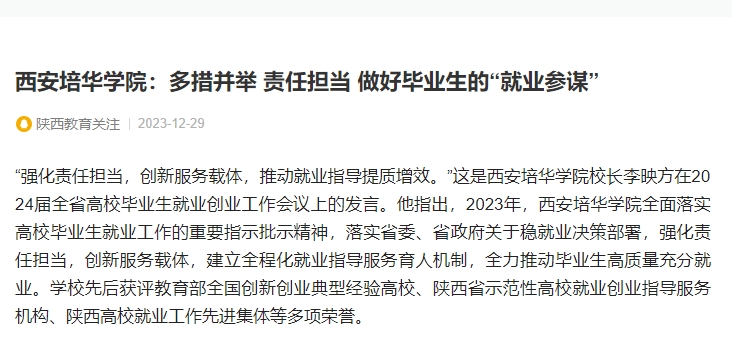 “强化责任担当,创新服务载体,推动就业指导提质增效。”这是西安培华学院校长李映方在2024届全省高校毕业生就业创业工作会议上的发言。他指出,2023年,西安培华学院全面落实高校毕业生就业工作的重要指示批示精神,落实省委、省政府关于稳就业决策部署,强化责任担当,创新服务载体,建立全程化就业指导服务育人机制,全力推动毕业生高质量充分就业。学校先后获评教育部全国创新创业典型经验高校、陕西省示范性高校就业创业指导服务机构、陕西高校就业工作先进集体等多项荣誉。