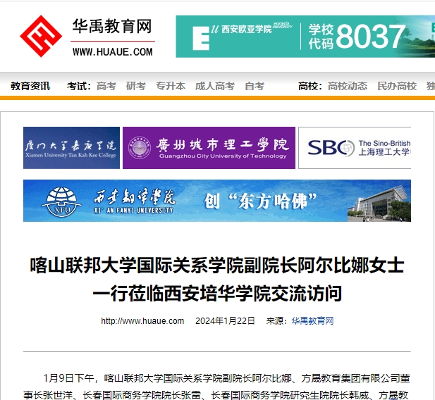 1月9日下午,喀山联邦大学国际关系学院副院长阿尔比娜、方晟教育集团有限公司董事长张世洋、长春国际商务学院院长张雷、长春国际商务学院研究生院院长韩威、方晟教育集团有限公司董事魏涛莅临西安培华学院交流访问。西安培华学院理事长姜波,副校长刘越莲、姚文静,校长助理秦海锋,中华传统文化研究院执行院长牟善荣,国际交流中心主任王鹏亲切接待了来宾一行。