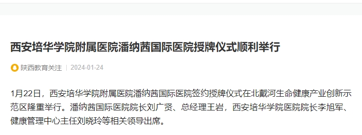 2024年1月22日,西安培华学院附属医院潘纳茜国际医院签约授牌仪式在北戴河生命健康产业创新示范区隆重举行。潘纳茜国际医院院长刘广贤、总经理王岩,西安培华学院医院院长李旭军、健康管理中心主任刘晓玲等相关领导出席。