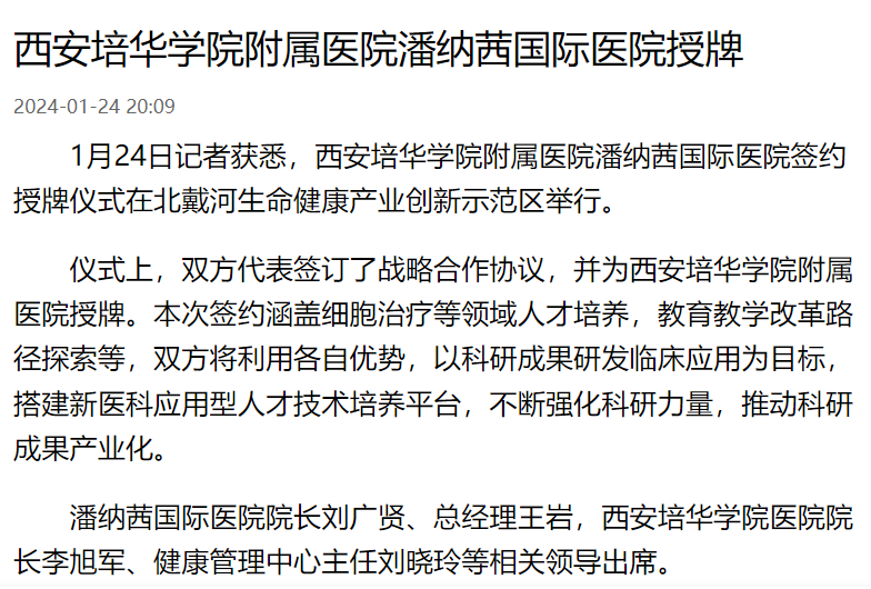 1月24日记者获悉,西安培华学院附属医院潘纳茜国际医院签约授牌仪式在北戴河生命健康产业创新示范区举行。