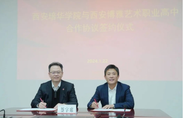 为了进一步加强中职与普通高校校际交流合作,形成中职与普通本科“3+4”贯通培养、产教深度融合的人才培养模式,1月22日,西安博雅艺术职业高中与西安培华学院签订《合作办学协议》。西安培华学院理事长姜波、校长助理秦海锋、合作发展中心主任柳雨、合作发展中心副主任刘斌、西安博雅艺术职业高中理事长白帆、党支部书记 校长张胜强、副校长岳飞出席签约仪式。