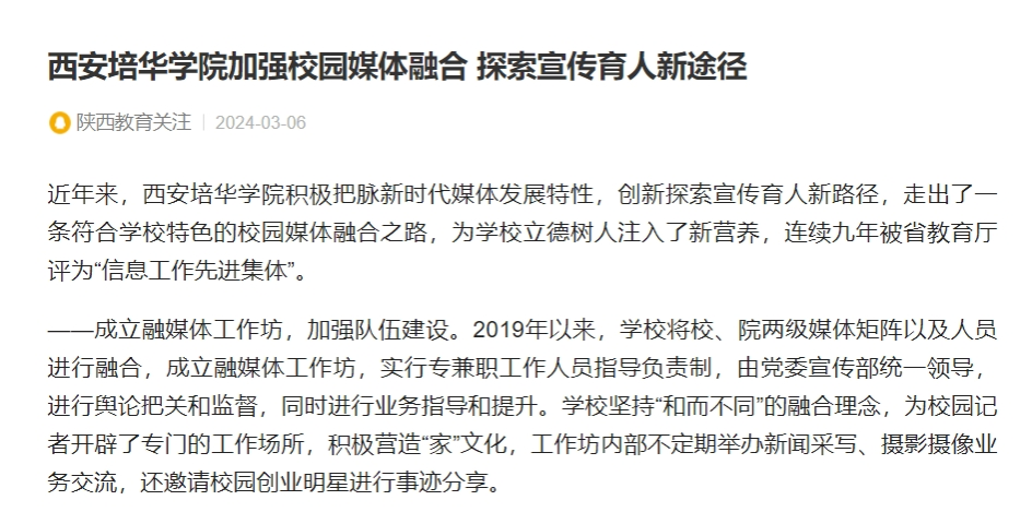 近年来,陕西省西安培华学院积极把脉新时代媒体发展特性,创新探索宣传育人新路径,走出了一条符合学校特色的校园媒体融合之路,连续9年被省教育厅评为“信息工作先进集体”。