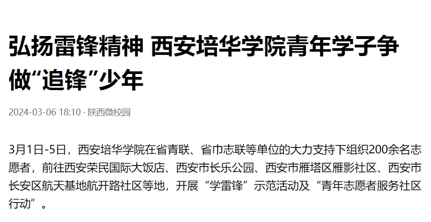 今日头条:弘扬雷锋精神 西安培华学院青年学子争做“追锋”少年