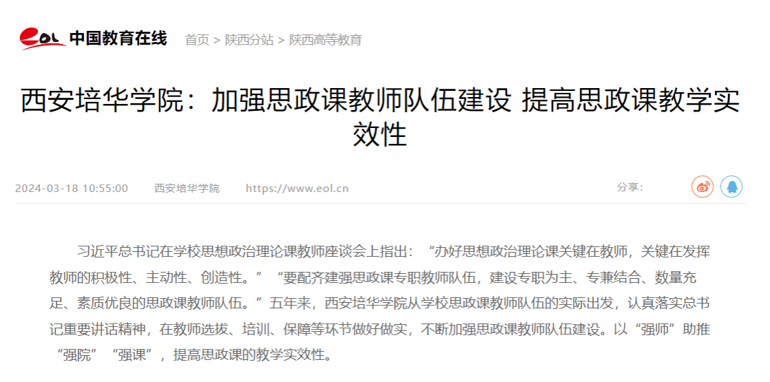 习近平总书记在学校思想政治理论课教师座谈会上指出:“办好思想政治理论课关键在教师,关键在发挥教师的积极性、主动性、创造性。”“要配齐建强思政课专职教师队伍,建设专职为主、专兼结合、数量充足、素质优良的思政课教师队伍。”五年来,西安培华学院从学校思政课教师队伍的实际出发,认真落实习近平总书记重要讲话精神,在教师选拔、培训、保障等环节做好做实,不断加强思政课教师队伍建设。以“强师”助推“强院”“强课”,提高思政课的教学实效性。