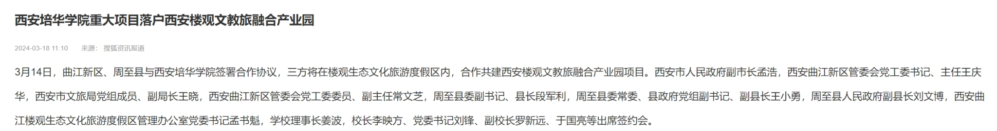 搜狐新闻:培华重大项目落户西安楼观文教旅融合产业园