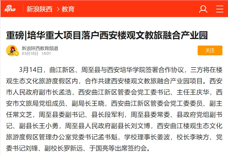 新浪:重磅|培华重大项目落户西安楼观文教旅融合产业园