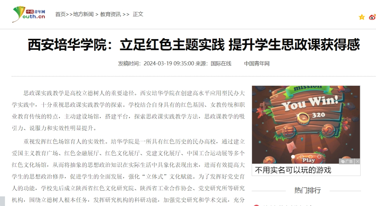 思政课实践教学是高校立德树人的重要途径。西安培华学院在创建高水平应用型民办大学实践中,十分重视思政课实践教学的探索。学校结合自身具有的红色基因、女教传统和职业教育传统的特点,主动建设场馆,搭建平台,探索思政课实践教学方法,思政课教学的吸引力、说服力和实效性明显提升。