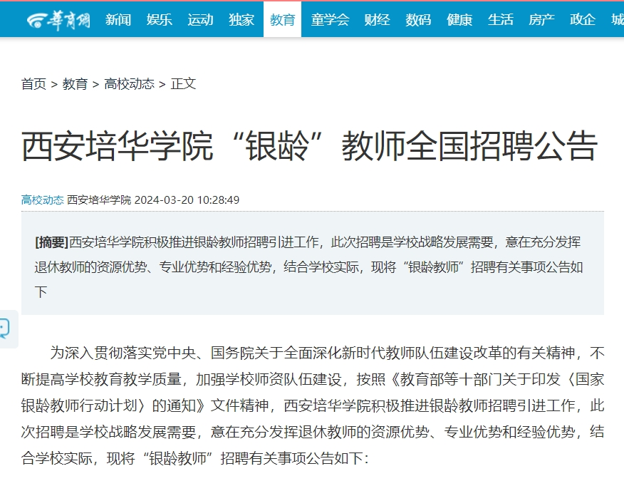为深入贯彻落实党中央、国务院关于全面深化新时代教师队伍建设改革的有关精神,不断提高学校教育教学质量,加强学校师资队伍建设,按照《教育部等十部门关于印发〈国家银龄教师行动计划〉的通知》文件精神,西安培华学院积极推进银龄教师招聘引进工作,此次招聘是学校战略发展需要,意在充分发挥退休教师的资源优势、专业优势和经验优势,结合学校实际,现将“银龄教师”招聘有关事项公告如下: