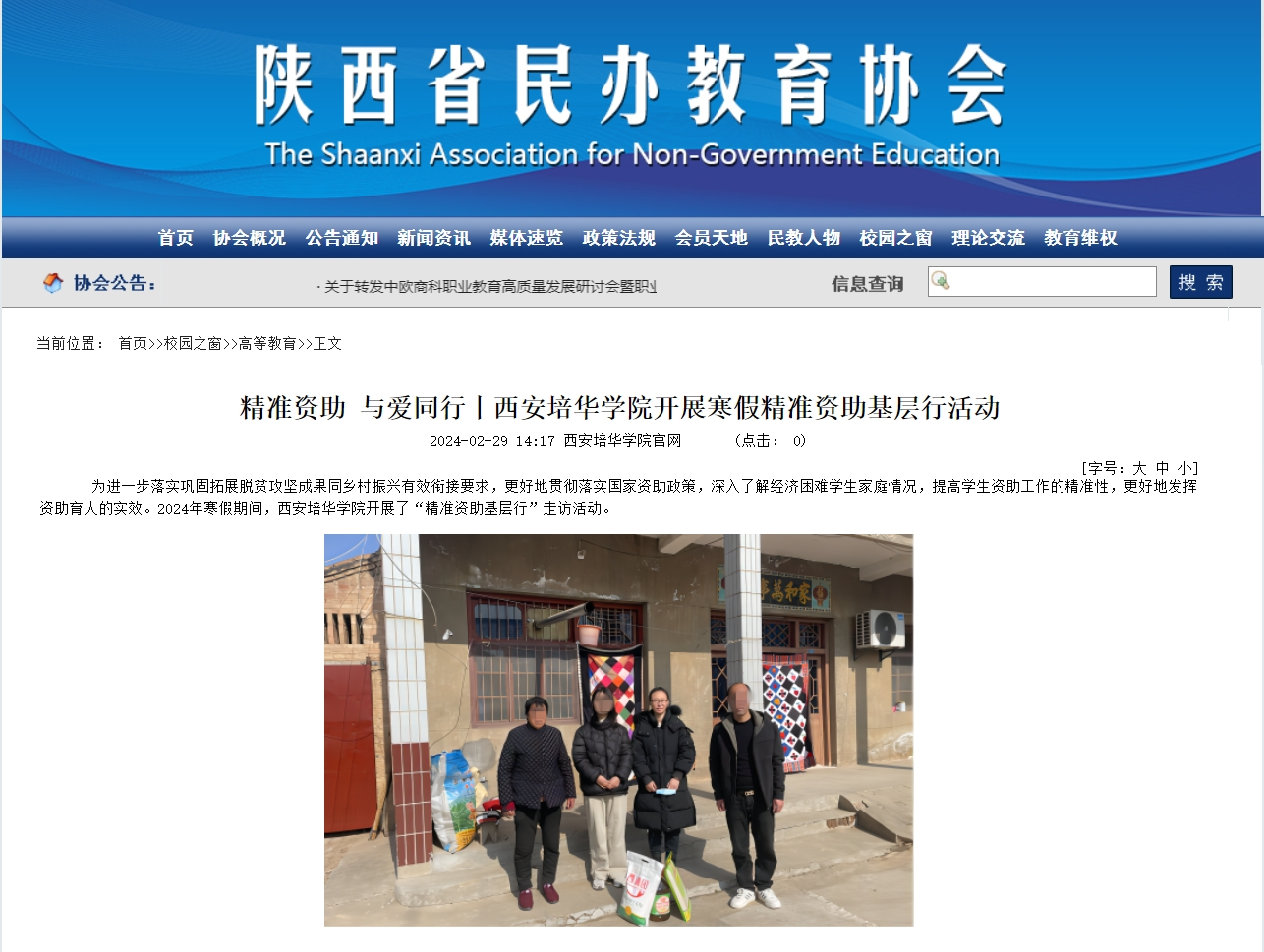 为进一步落实巩固拓展脱贫攻坚成果同乡村振兴有效衔接要求,更好地贯彻落实国家资助政策,深入了解经济困难学生家庭情况,提高学生资助工作的精准性,更好地发挥资助育人的实效。2024年寒假期间,西安培华学院开展了“精准资助基层行”走访活动。