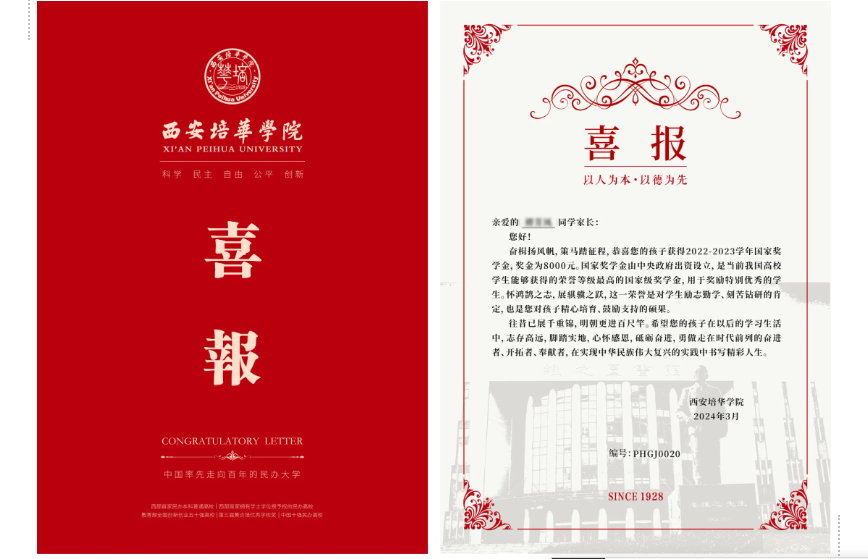 这批“特殊快递”内含荣誉证书、获奖喜报和《记忆培华》书籍。喜报上写着:恭喜您的孩子获得2022-2023学年国家奖学金……这一荣誉是对学生励志勤学、刻苦钻研的肯定,也是您对孩子精心培育、鼓励支持的硕果。每一份喜报都有来自学校的祝福,每一个红印章都代表着认可与激励。