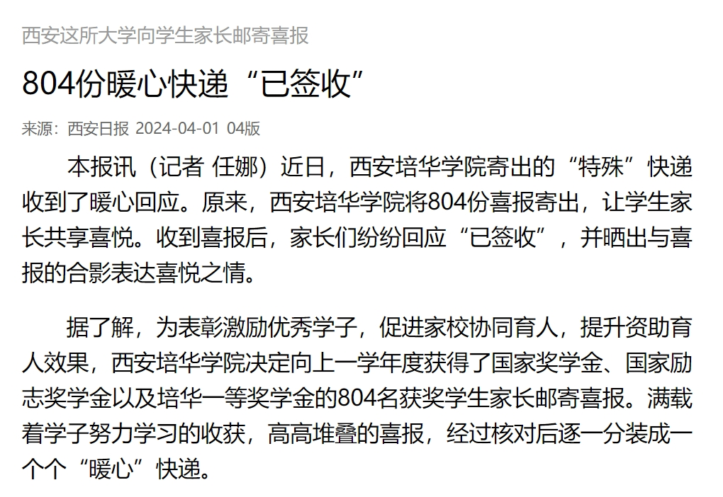 近日,西安培华学院寄出的“特殊”快递收到了暖心回应。原来,西安培华学院将804份喜报寄出,让学生家长共享喜悦。收到喜报后,家长们纷纷回应“已签收”,并晒出与喜报的合影表达喜悦之情。
