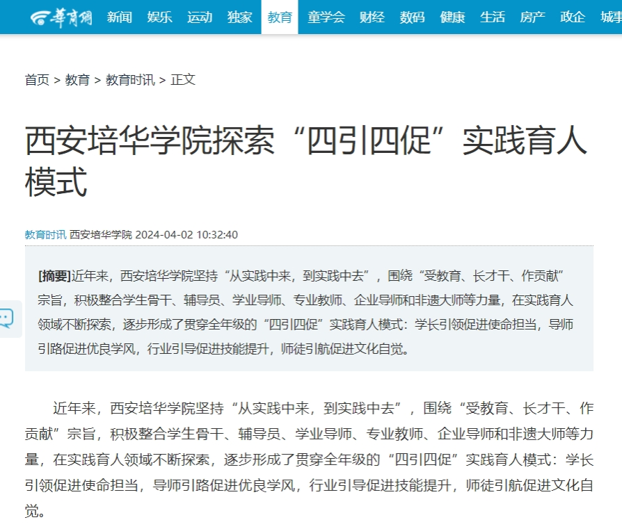 近年来,西安培华学院坚持“从实践中来,到实践中去”,围绕“受教育、长才干、作贡献”宗旨,积极整合学生骨干、辅导员、学业导师、专业教师、企业导师和非遗大师等力量,在实践育人领域不断探索,逐步形成了贯穿全年级的“四引四促”实践育人模式:学长引领促进使命担当,导师引路促进优良学风,行业引导促进技能提升,师徒引航促进文化自觉。